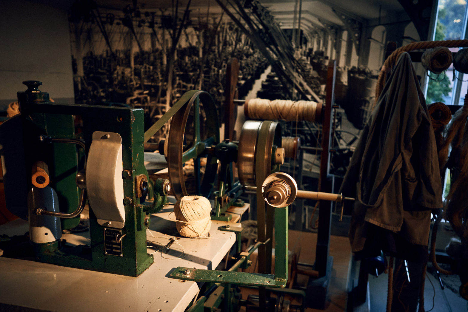 Wie ein riesiges Flechtwerk durchziehen Transmissionsriemen die Fabrikhalle. Erst im Laufe des 20. Jahrhunderts wurde die Kraftübertragung mittels einer zentralen Turbine durch elektrisch betriebene Maschinen abgelöst. Das Unfall- und Verletzungsrisiko durch die Transmission und schnell drehende Teile war hoch. Die Frauen trugen deshalb am Arbeitsplatz meist hochgesteckte Haare oder Kopftücher. Neben hohem Lärmpegel und einer konstanten Staubbelastung in den verschiedenen Arbeitsbereichen setzten den Beschäftigten mitunter auch extreme Temperaturen, meist Hitze aber auch Kälte zu.