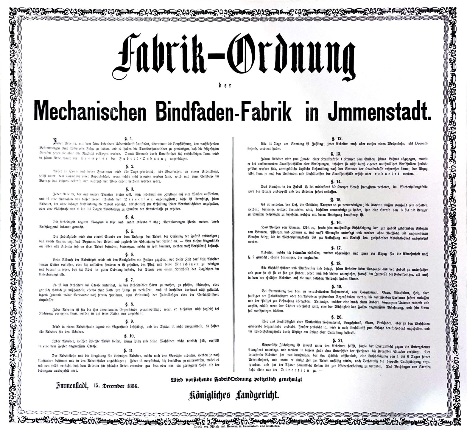 Hinter der Fabrikpforte und dem geschlossenen Fabriktor wird Disziplin und Arbeit im Maschinentakt verlangt, was sich auch durch die Fabrikordnung ausdrückt. In der Immenstädter Mechanischen Bindfadenfabrik war die Fabrikordnung von 1856 als Plakat für alle sichtbar in den Werkhallen angeschlagen. Jeder Arbeiter und jede Arbeiterin hatte den gesamten Katalog an Vorschriften zu kennen.