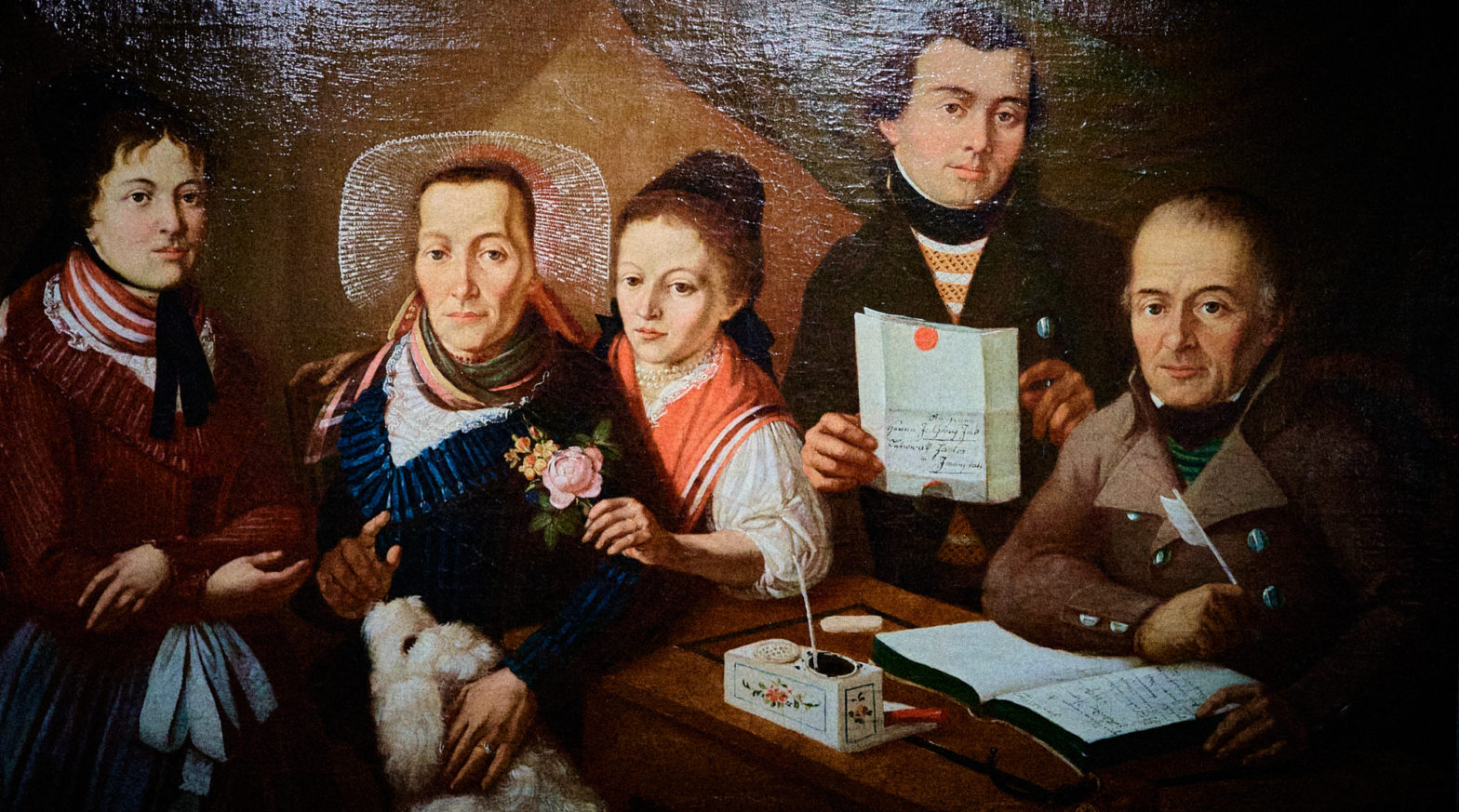 Entstanden in einer politisch unruhigen Zeit und einer beginnenden Krise für die Allgäuer Leinwandproduktion – zeigt dieses Gemälde von 1805 den Leinwandfaktor Johann Georg Jeck mit seiner Familie, um seinen Schreibtisch versammelt.