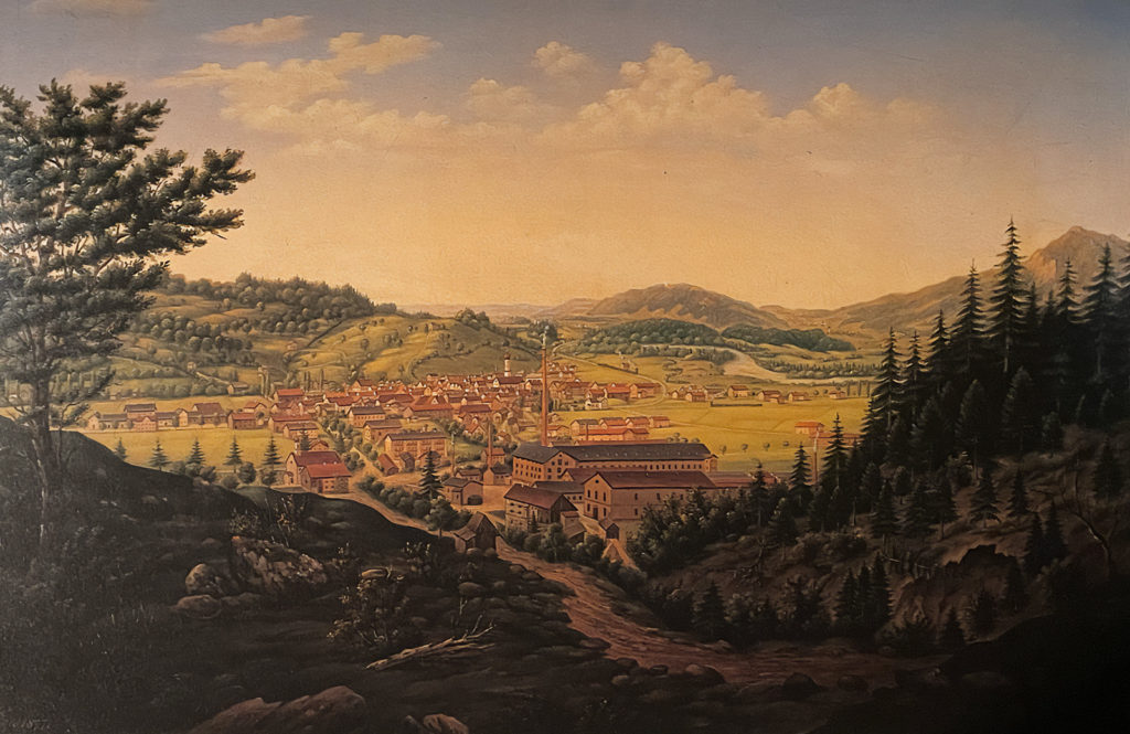 Das Ölgemälde von Xaver Glötzle aus dem Jahre 1877 zeigt im Vordergrund links die Pechhütte am Steigweg und die Achsenschmiede neben den langgestreckten Gebäuden der Mechanischen Bindfadenfabrik.