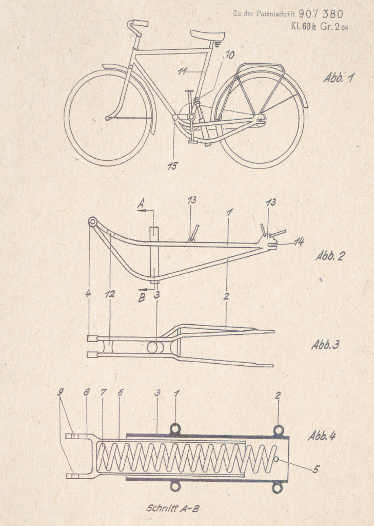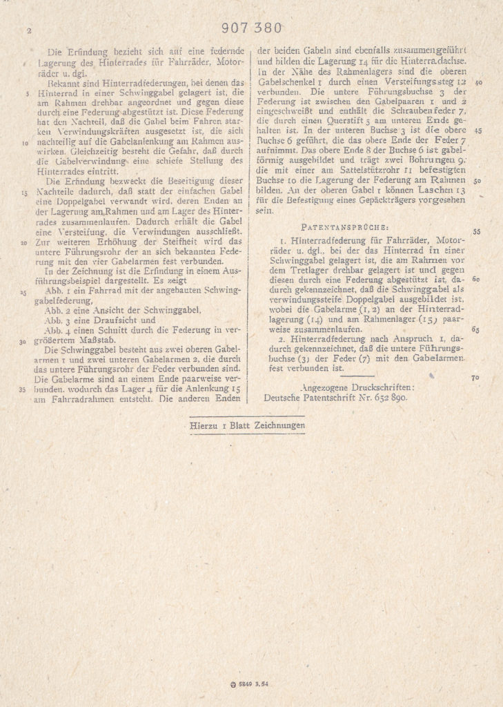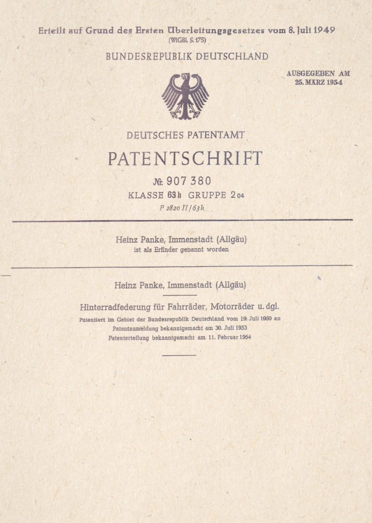 Die Patentschrift 907380 des Deutschen Patentamtes von 1954 bezieht sich auf die Erfindung einer federnden Lagerung des Hinterrades für Fahrräder und Motorräder.