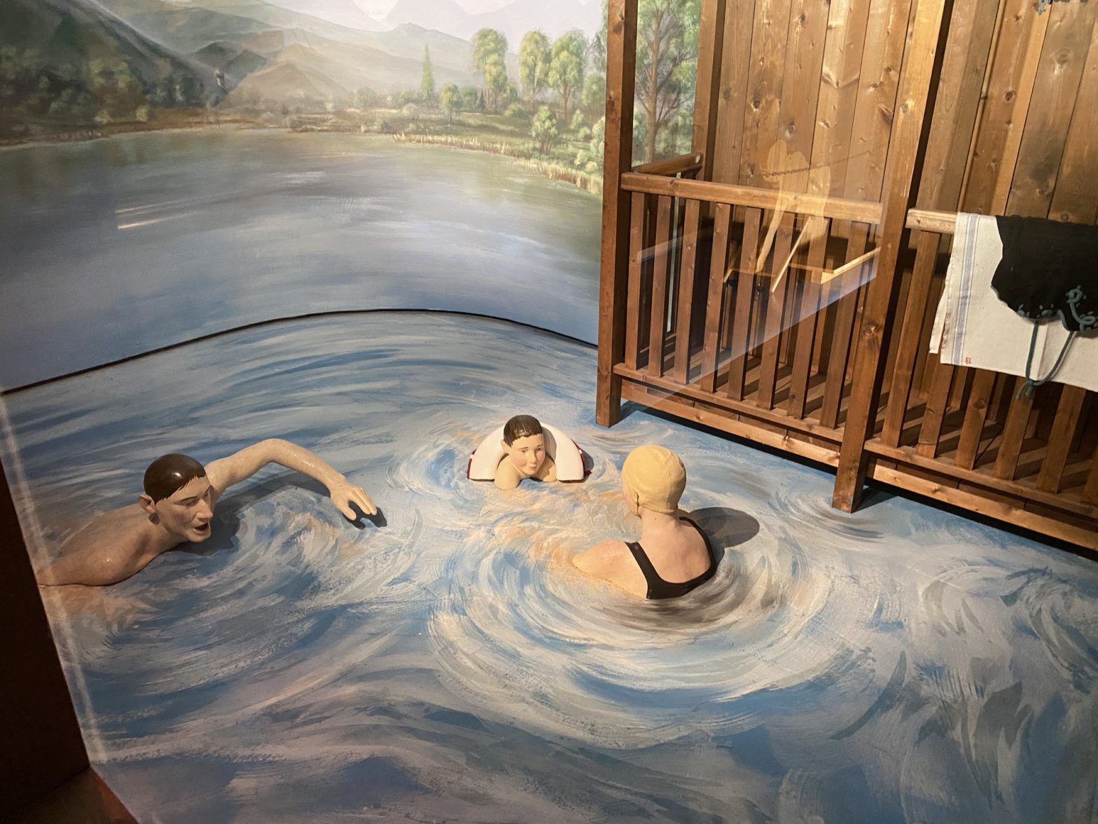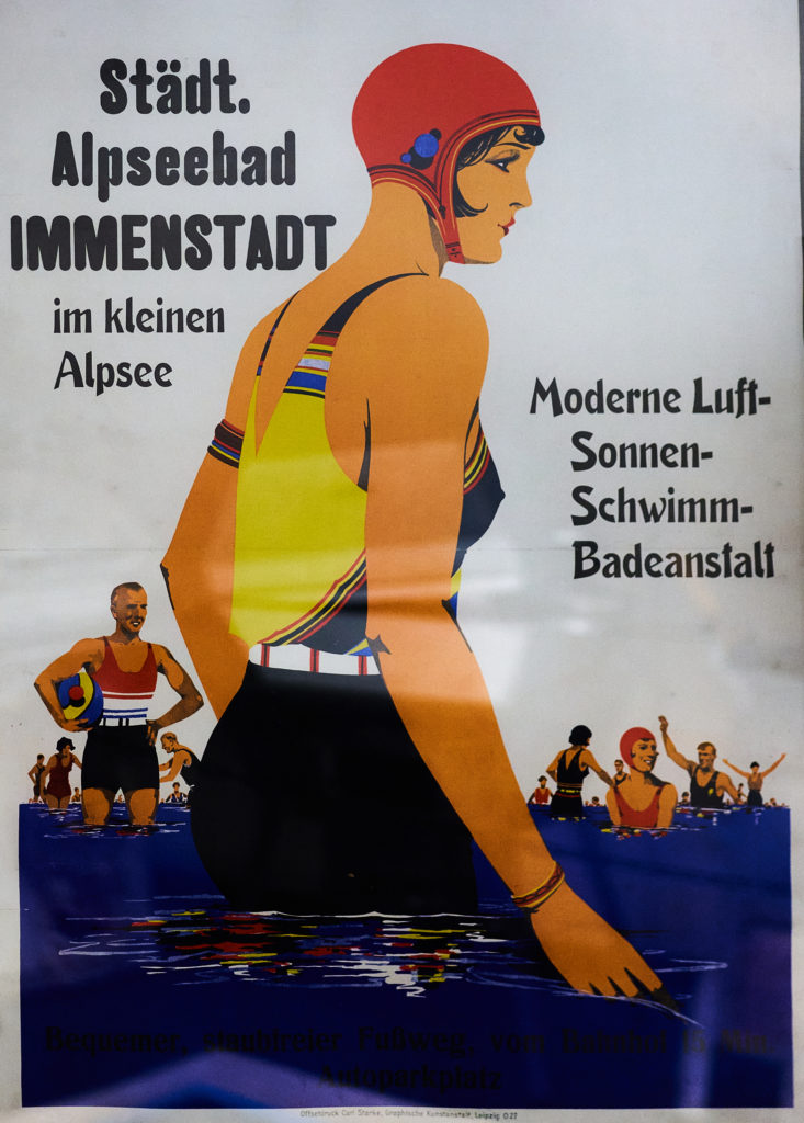Das Plakat „Städt. Alpseebad Immenstadt im kleinen Alpsee“ verspricht um 1925 Entspannung und Badefreuden im modernen Ambiente der neugebauten „Luft- Sonnen- Schwimm- Badeanstalt“ am Nordufer des Sees. Badegäste in farbenfroher Bademode tummeln sich in ultramarinblauem Wasser und ein „bequemer, staubfreier Fußweg, vom Bahnhof 15 Min.“ entfernt und ein „Autoparkplatz“ werden beworben. Immenstadt war zu diesem Zeitpunkt bereits ein etabliertes Ziel für erholungssuchende Gäste. 1979 wurde die Badeeinrichtung durch ein beheiztes Freibad abgelöst, das zusätzlich zum Seewasser auch Schwimmbecken zum Baden bietet.